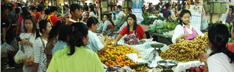 of a fresh market that distributes fruits, vegetables, meats, seafood, dried foods, groceries and snacks. Products