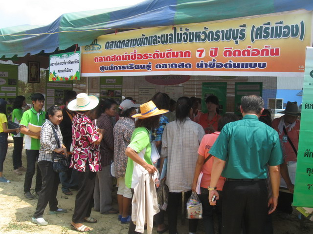 อาจารย์ธนภณ พัฒนา ตัวแทนตลาดศรีเมือง นำเจ้าหน้าที่ศูนย์ตรวจสอบสารพิษตกค้างตลาดศรีเมือง สาธิตการตรวจสารพิษตกค้างในงาน Learning Day ในเดือนเมษายน 2557 จัดโดย สำนักงานเกษตรจังหวัดราชบุรี