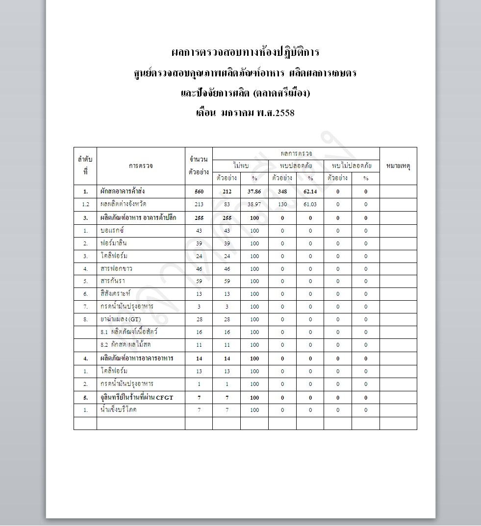 รายงานผลการตรวจสอบทางห้องปฏิบัติการ ศูนย์ตรวจสอบคุณภาพผลิตภัณฑ์อาหาร ผลิตผลการเกษตร และปัจจัยการผลิต เดือน มกราคม 2558    11 ก.พ. 2558