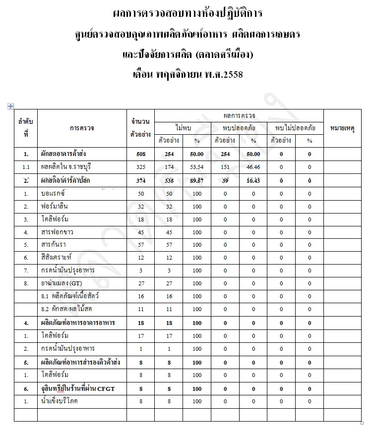 ผลการตรวจสอบทางห้องปฏิบัติการ ศูนย์ตรวจสอบคุณภาพผลิตภัณฑ์อาหาร ผลิตผลการเกษตร และปัจจัยการผลิต (ตลาดศรีเมือง) เดือน พฤศจิกายน พ.ศ.2558     24 ธ.ค. 2558
