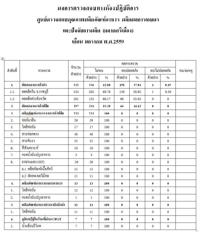 ผลการตรวจสอบทางห้องปฏิบัติการ ศูนย์ตรวจสอบคุณภาพผลิตภัณฑ์อาหาร ผลิตผลการเกษตร และปัจจัยการผลิต (ตลาดศรีเมือง) เดือน มกราคม พ.ศ.2559     11 ก.พ. 2559