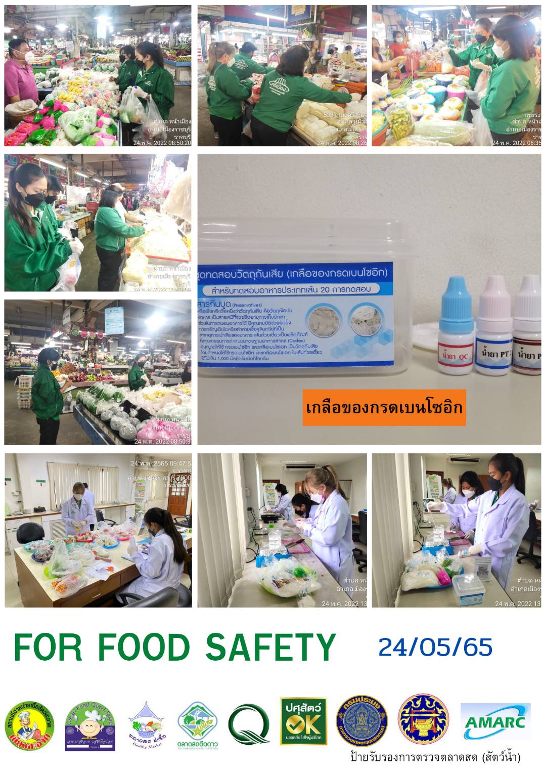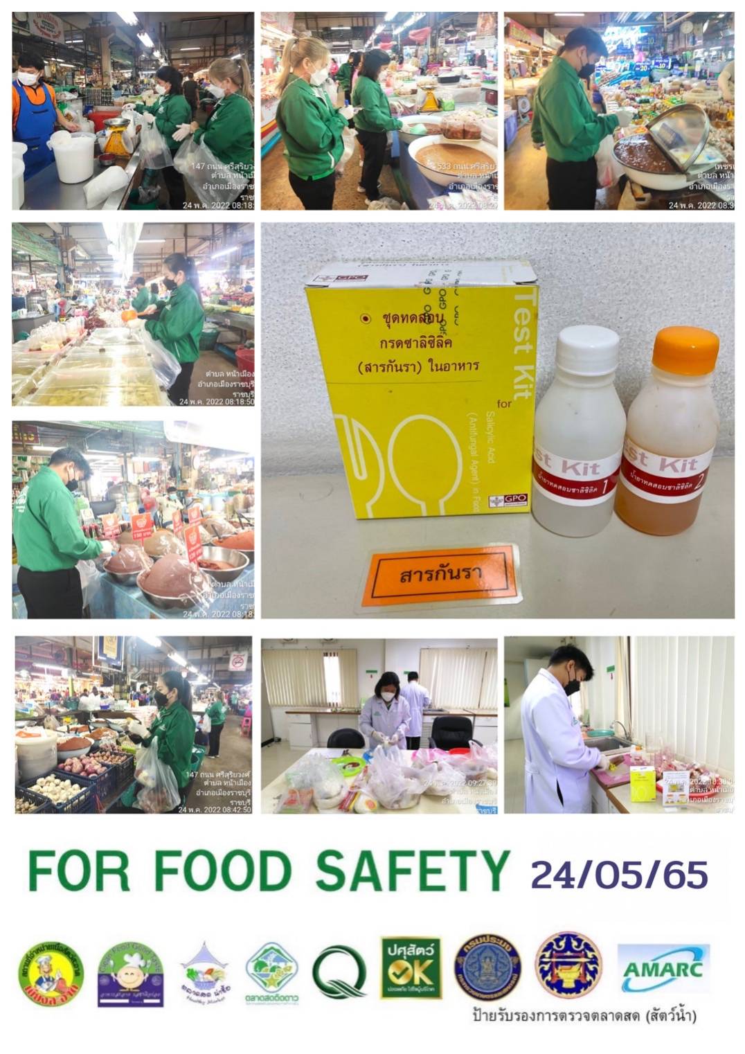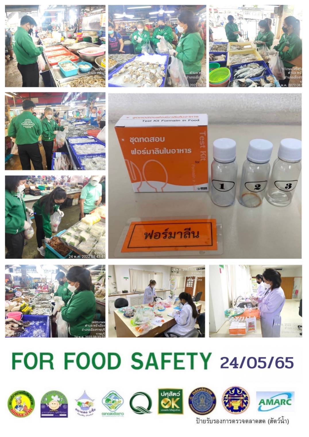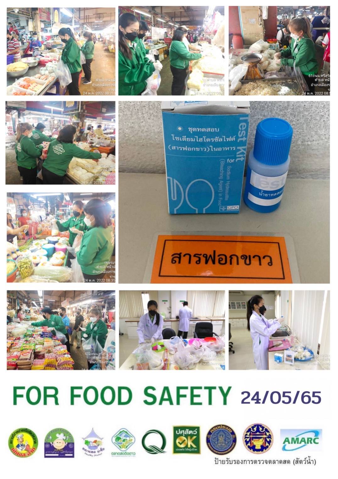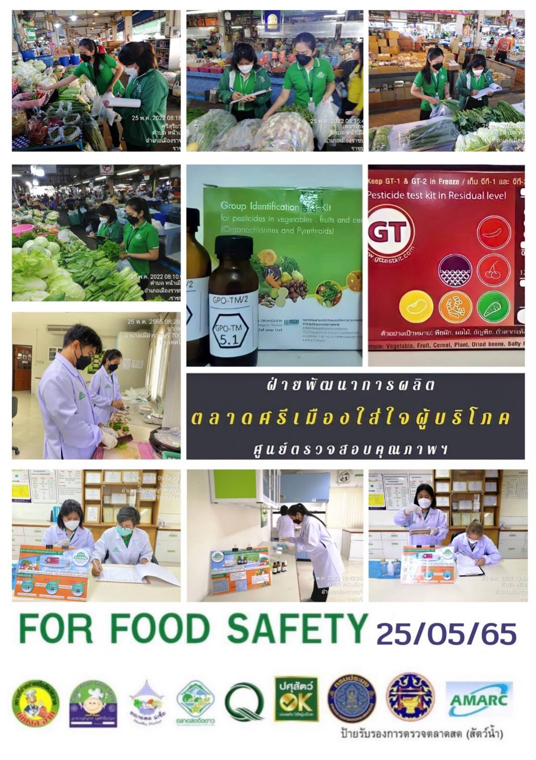 สรุปผลการตรวจสอบสารพิษตกค้างในผลผลิตการเกษตร​และผลิตภัณฑ์​อาหาร (ตลาดศรีเมือง)​ ประจำเดือน พฤษภาคม 2565 - GT จำนวน 1,155 ตัวอย่าง ไม่พบ​ 1,107 ตัวอย่าง พบในระดับปลอดภัย​ 48 ตัวอย่าง - GPO จำนวน 94 ตัวอย่าง ไม่พบ 94 ตัวอย่าง - บอแรกซ์​ 53 ตัวอย่าง ไม่พบ 53 ตัวอย่าง - ฟอร์มาลีน 38 ตัวอย่าง ไม่พบ 36 ตัวอย่าง พบไม่ปลอดภัย 2 ตัวอย่าง - สารเร่งเนื้อแดง 21 ตัวอย่าง ไม่พบ 21 ตัวอย่าง - สารฟอกขาว 49 ตัวอย่าง ไม่พบ 49 ตัวอย่าง - สารกันรา 88 ตัวอย่าง ไม่พบ 88 ตัวอย่าง - สีสังเคราะห์​ 32 ตัวอย่าง ไม่พบ 32 ตัวอย่าง - โพลาร์ในน้ำมันทอดซ้ำ 11 ตัวอย่าง ไม่พบ 11 ตัวอย่าง - สารกันบูด​ 20 ตัวอย่าง ไม่พบ 20 ตัวอย่าง - สารไนไตรท์​ 9 ตัวอย่าง ไม่พบ 9 ตัวอย่าง - เชื้อโคลิฟอร์ม 473 ตัวอย่าง ไม่พบ 473 ตัวอย่าง