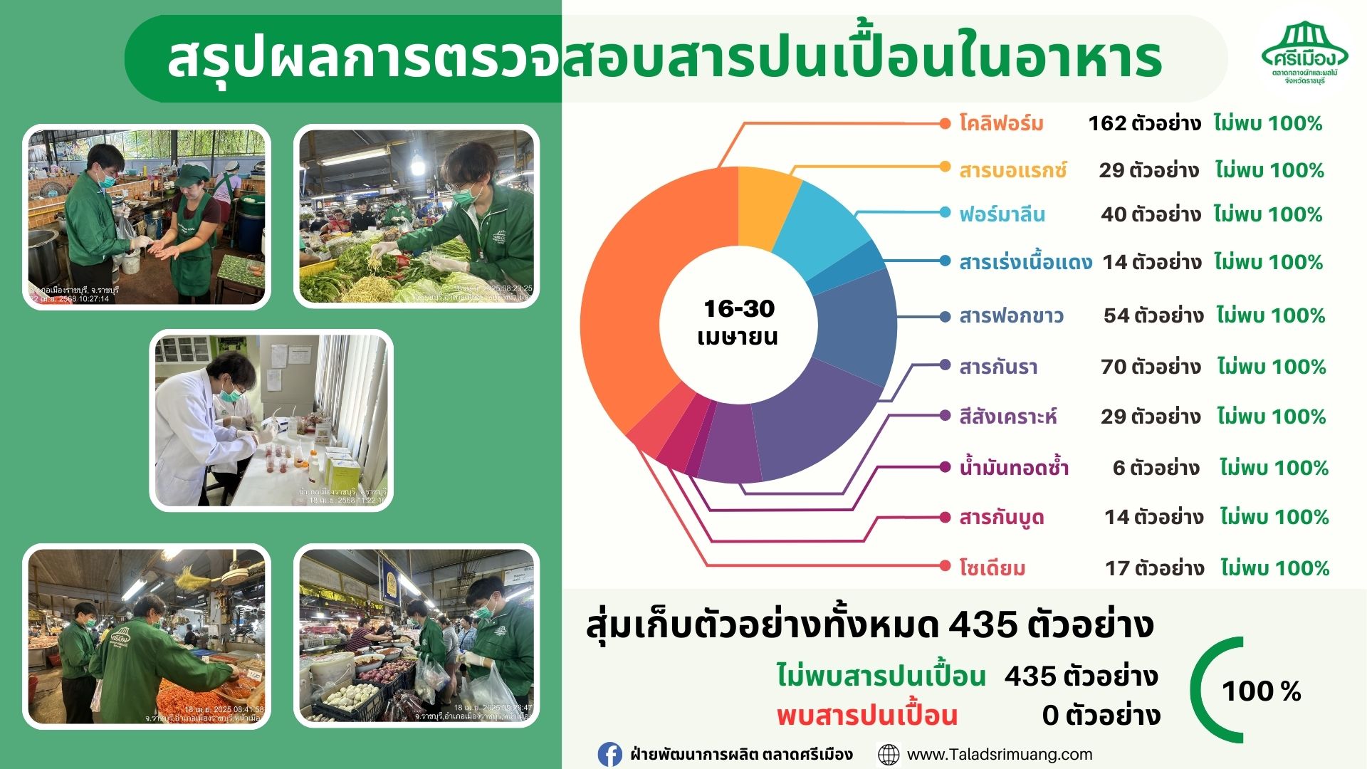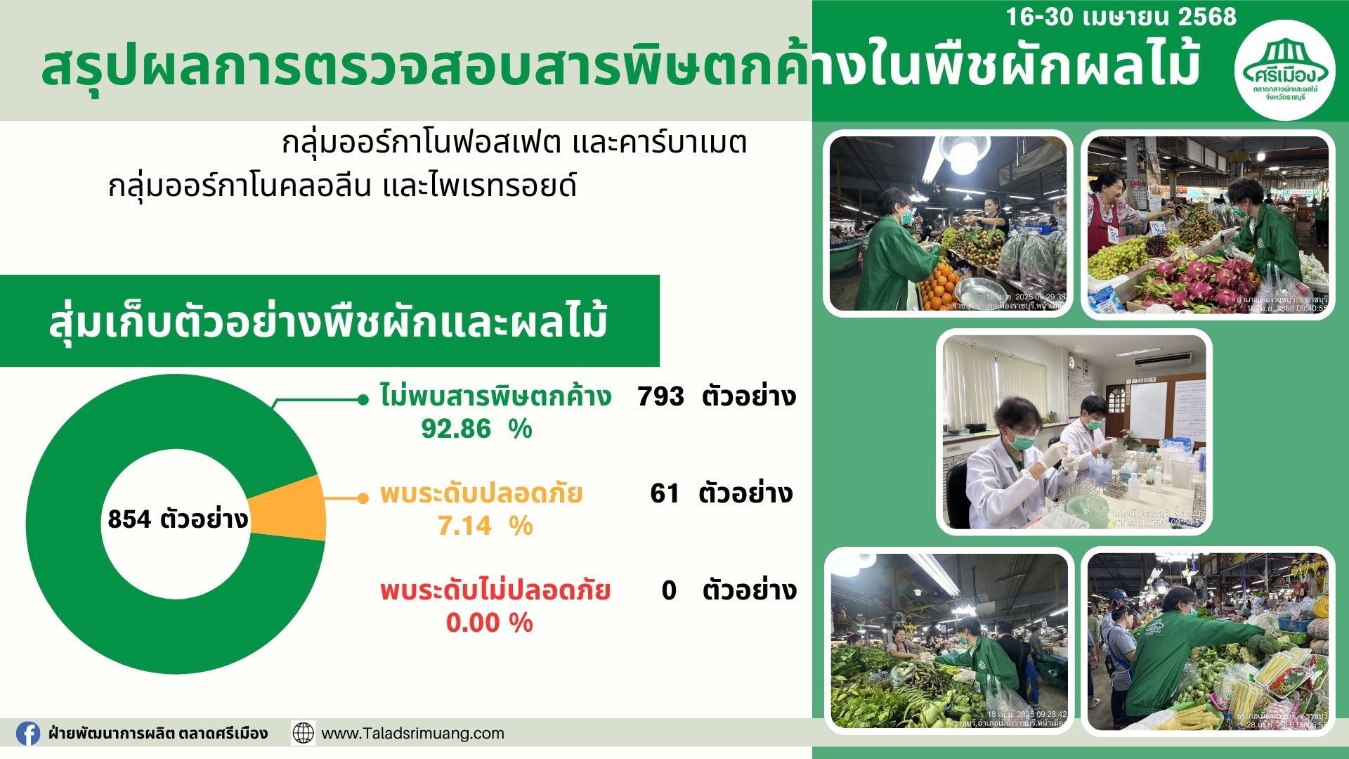 ศูนย์ตรวจสอบคุณภาพฯตลาดศรีเมืองสุ่มเก็บตัวอย่างพืชผัก และ ผลไม้ในตลาดศรีเมืองโดยสรุผลการตรวจสอบสารพิษตกค้าง (ยาฆ่าแมลง) ดังนี้ ห้วง 16-30 เม.ย. 68 -สุ่มเก็บตัวอย่างพืชผักและผลไม้ ทั้งหมด 854 ตัวอย่าง พบปลอดภัย 7.14% พบไม่ปลอดภัย 0.00% ไม่พบ 92.86% -สรุปผลการตรวจสอบสารปนเปื้อนในอาหาร สุ่มเก็บตัวอย่างทั้งหมด 435 ตัวอย่าง ไม่พบสารปนเปื้อน 435 ตัวอย่าง พบสารบนเปื้อน 0 ตัวอย่าง