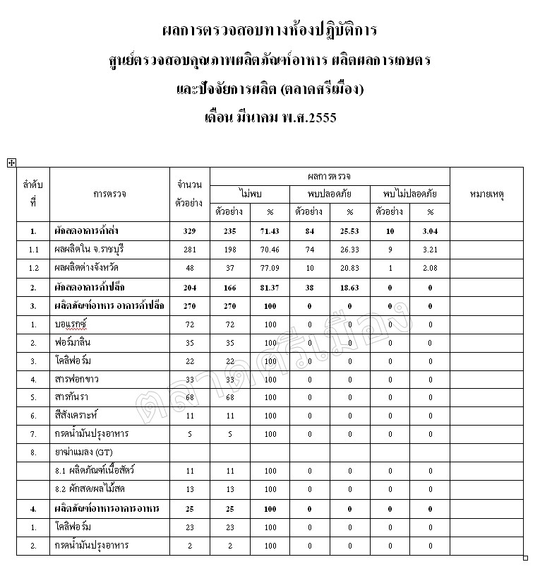 ผลการตรวจสอบทางห้องปฏิบัติการ เดือน มีนาคม พ.ศ 2555    12 พ.ค. 2555