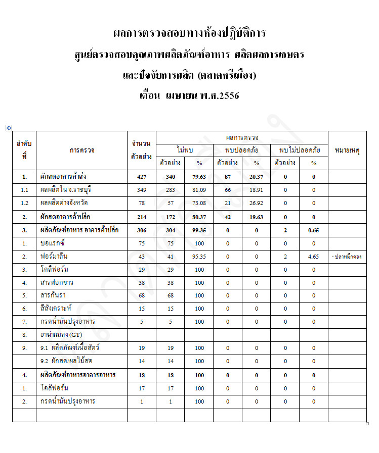 ผลการตรวจสอบทางห้องปฏิบัติการ เดือน เมษายน พ.ศ 2556    21 มิ.ย. 2556