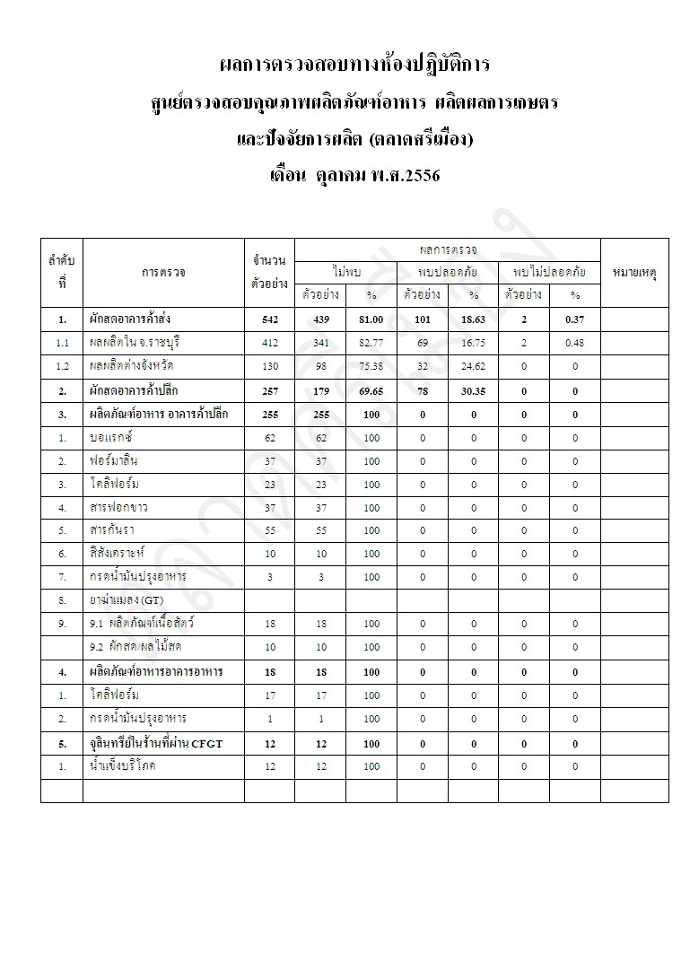 ผลการตรวจสอบทางห้องปฏิบัติการ เดือน ตุลาคม พ.ศ 2556    7 พ.ย. 2556