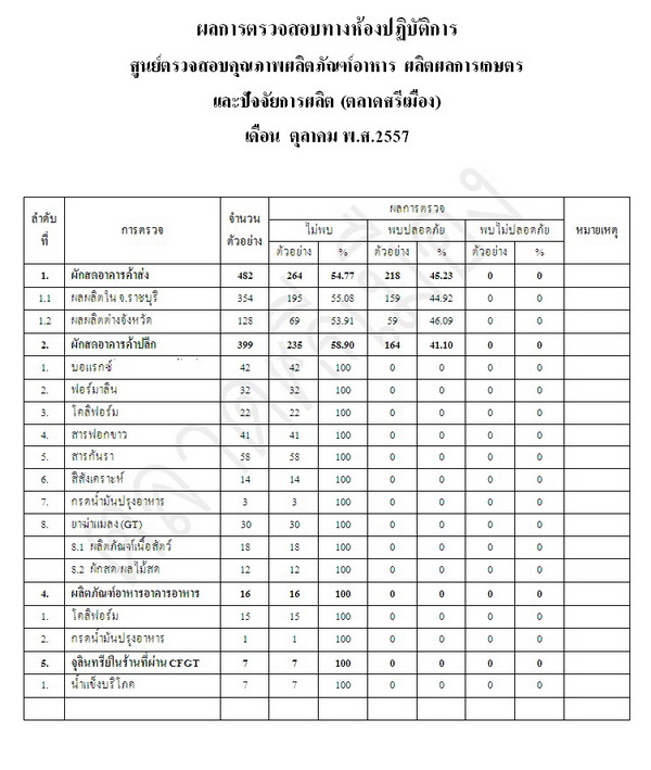 รายงานผลการตรวจสอบทางห้องปฏิบัติการ ศูนย์ตรวจสอบคุณภาพผลิตภัณฑ์อาหาร ผลิตผลการเกษตร และปัจจัยการผลิต เดือน ตุลาคม 2557    17 พ.ย. 2557