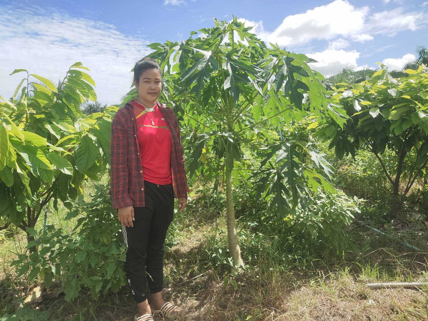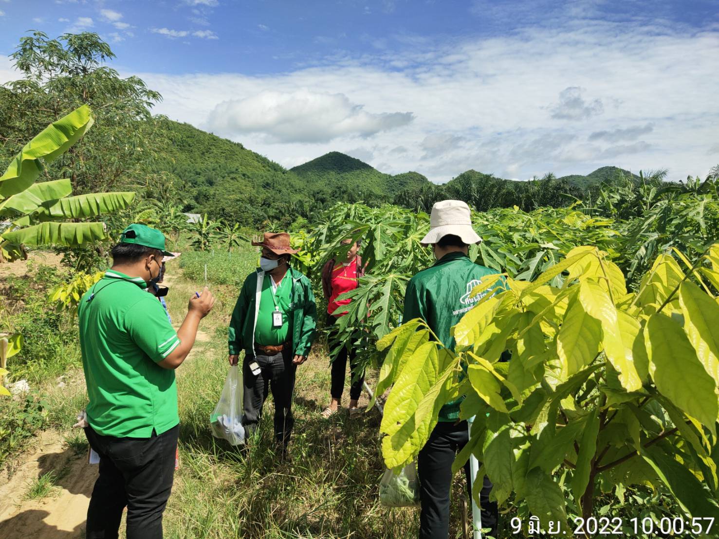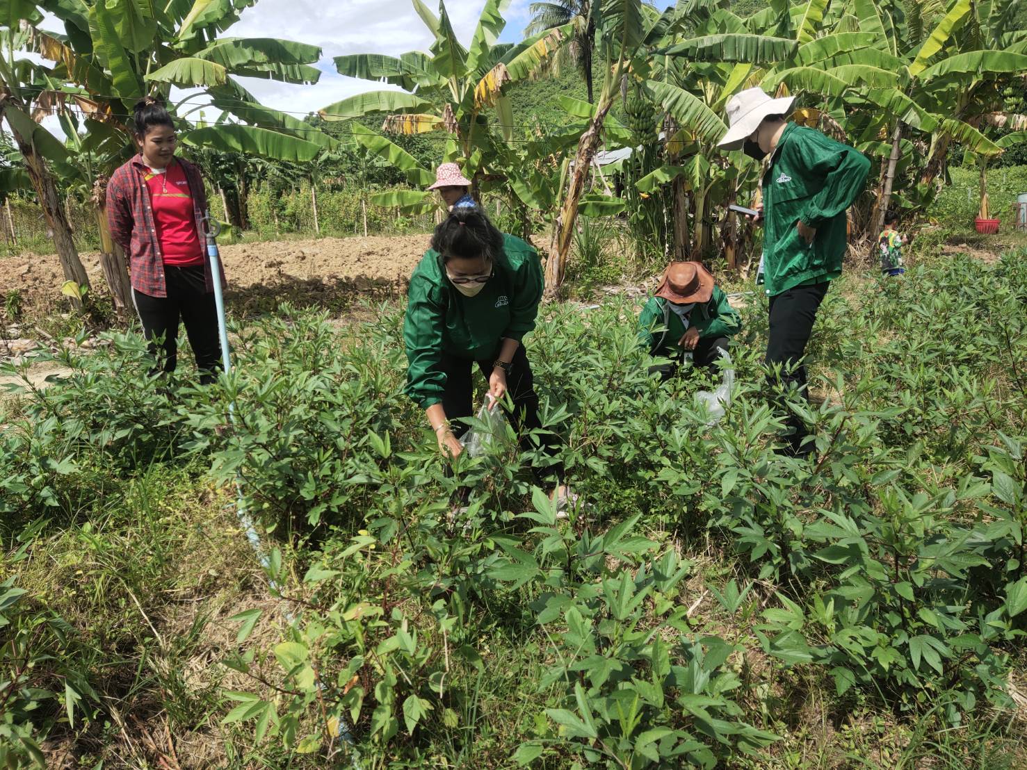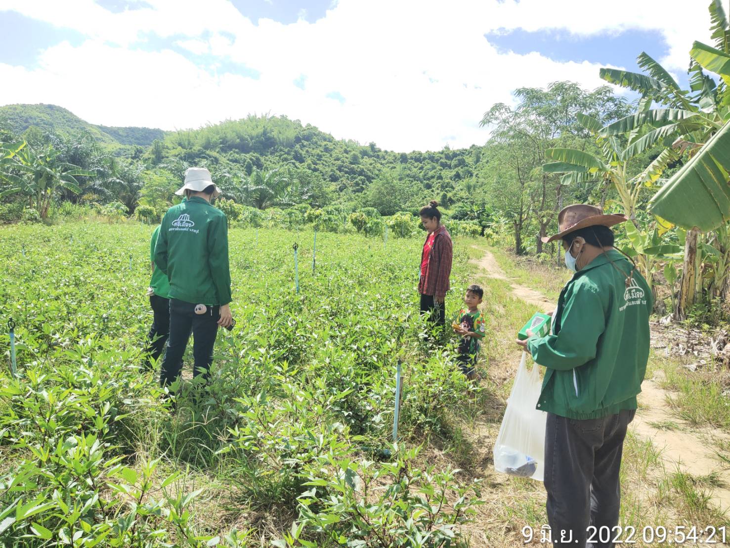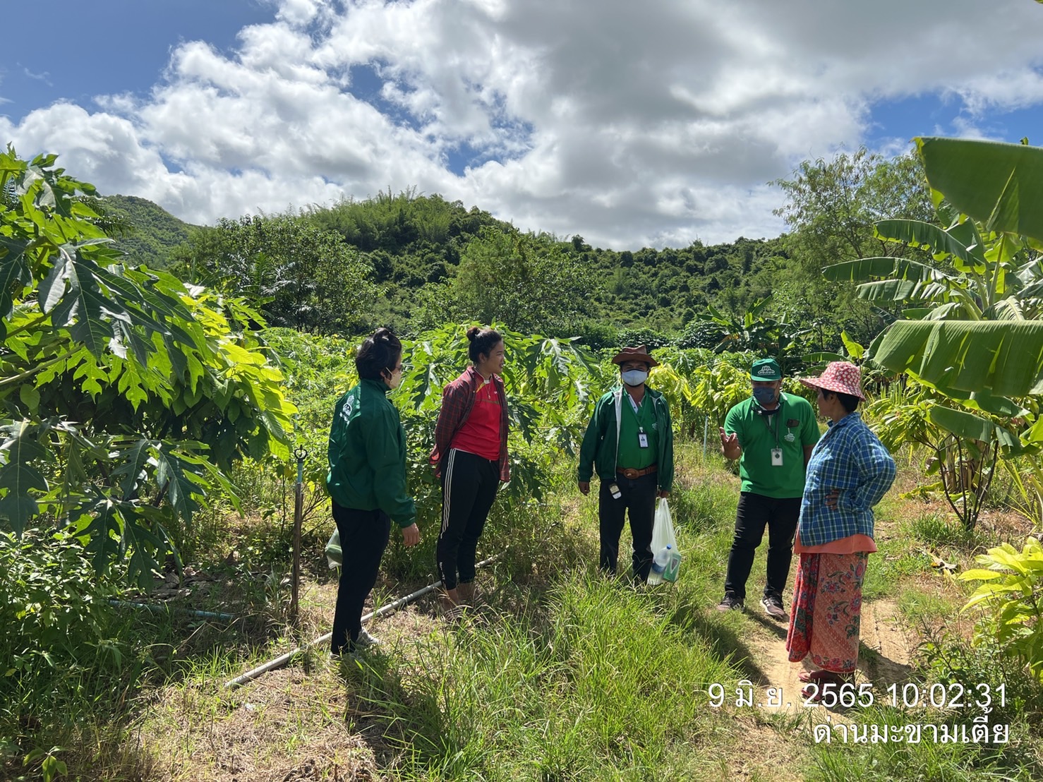 ภาคเช้าวันที่ 9มิถุนายน 2565 เวลา10.30น.ฝ่ายพัฒนาการผลิต ออกพื้นที่ตรวจแปลงคุณจุฑารัตน์ ยางอ่อน สมาชิกในโครงการผักปลอดภัยกลุ่มบ้านวังปลา ต.จรเข้เผือก อ.ด่านมะข้ามเตี้ย จ.กาญจนบุรี ขอเพิ่มชนิดพืช ใบกระเจี๊ยบและมะละกอ เข้าจำหน่ายในโครงการ ฝ่ายดำเนินการเก็บข้อมูลการผลิต,เก็บตัวอย่างผลผลิต,ตรวจวัดค่าpHดินและน้ำผลการตรวจค่าphได้เท่ากับ 6.8 และทางฝ่ายได้ตรวจพบใบกระเจี๊ยบและต้นมีอาการเหี่ยวและยืนต้นตาย สาเหตุเกิดจากเชื้อรา ฝ่ายได้แนะนำใช้สารชีวภัณฑ์ ในการป้องกันกำจัด เชื้อสาเหตุ : รา Phytophthora parasitica Dastur ชีววิทยาของเชื้อ : รา P. parasitica เป็นราที่ชอบน้ำ (water mold) ลักษณะโคโลนีที่เจริญบนอาหาร PDA คล้ายเส้นใยแมงมุม เส้นใยของราพวกนี้ไม่มีผนังกั้น ผิวผนังเรียบ เชื้อเจริญเต็มจานเลี้ยงเชื้อเมื่ออายุ 5 วัน สร้าง sporangia น้อย หรือไม่สร้าง sporangia บนผิวอาหารแข็ง เมื่อตัดชิ้นเชื้อแช่ในน้ำที่นึ่งฆ่าเชื้อแล้ว ทิ้งไว้ 24-36 ชั่วโมง เชื้อสร้าง sporangia จำนวนมากในน้ำ มีรูปค่อนข้างกลมรูปแพร์หรือกลม มีปุมนูน ชัดเจนบนสปอร์ ซึ่งติดแน่นกับเส้นใย สปอร์ผนังหนามี papilla เห็นเด่นชัด ลักษณะอาการ : เชื้อเข้าทำลายบริเวณรากและลำด้น ทำให้มะเขือแสดงอาการเหี่ยวเฉาเหมือนขาดน้ำ เมื่อใช้มีดเฉือนตามขวางลำต้นพบท่อน้ำท่ออาหารถูกทำลาย เนื้อเยื่อพืชเป็นสีน้ำตาลดำหรือสีดำ เกิดการ เน่ารอบต้นทำให้ส่วนที่เป็นโรคจนถึงยอด มีอาการเหี่ยวและแห้งตาย หากเชื้อเข้าทำลายใบ ทำให้ใบไหม้คล้าย ถูกน้ำร้อนลวก เชื้อเข้าทำลายที่บริเวณขั้วผลโดยการกระเด็นของน้ำ หรือบริเวณปลายผลที่ติดกับพื้นดิน ทำให้ เกิดอาการฉ่ำน้ำ แล้วลุกลามขยายออกไปอย่างรวดเร็ว จนทำให้ผลเน่าดำเกือบทั้งผล การป้องกันกำจัด : หลังจากที่ได้วิเคราะห์สาเหตุของโรคแล้วทางฝ่ายฯได้แนะนำให้เกษตรกรเก็บเศษซากพืชหรือส่วนที่เป็นโรคออกไปเผาลดปริมาณการให้น้ำลง(เพราะดูจากพื้นที่แล้วให้น้ำมากไปและแฉะ)ควรทำร่องระบายน้ำให้ดี ไม่เป็นที่น้ำขังและไม่ปลูกมะเขือแน่นและแนะนำให้เกษตรกรฉีดพ่นด้วยเชื้อรา Trichoderma harzianum สลับกับการใช้เชื้อ Bacillus subtilis ฉีดพ่นในช่วงแรก ทั้งพ้นที่ลำตันพืชและพ่นลงในดิน จะช่วยกำจัดเชื้อสาเหตุได้