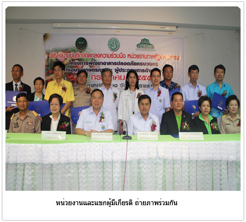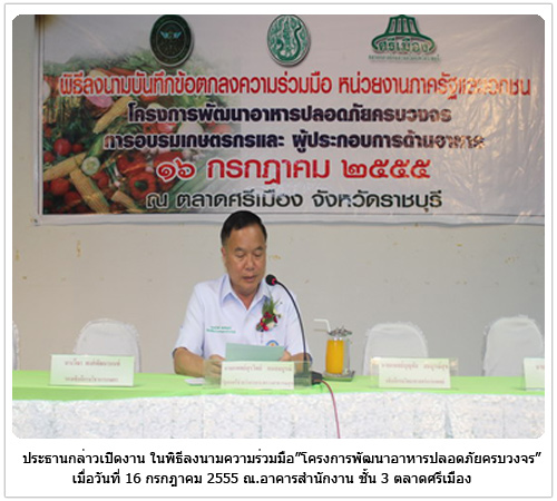 ฝ่ายพัฒนาการผลิต ตลาดศรีเมือง ได้ร่วม“โครงการพัฒนาอาหารปลอดภัยครบวงจร” กับศูนย์วิทยาศาสตร์การแพทย์สมุทรสงคราม และหน่วยงานภาครัฐ รวมทั้งสิ้น 8 หน่วยงาน เพื่อบูรณาการคุณภาพอาหารปลอดภัย ตั้งแต่เกษตรกร ผู้ค้า ผู้บริโภค มีพิธีลงนามความร่วมมือ เมื่อวันที่ 16 กรกฎาคม 2555 โดยนายแพทย์สุรวิทย์ คนสมบูรณ์ รัฐมนตรีช่วยว่าการกระทรวงสาธารณสุข เป็นประธาน