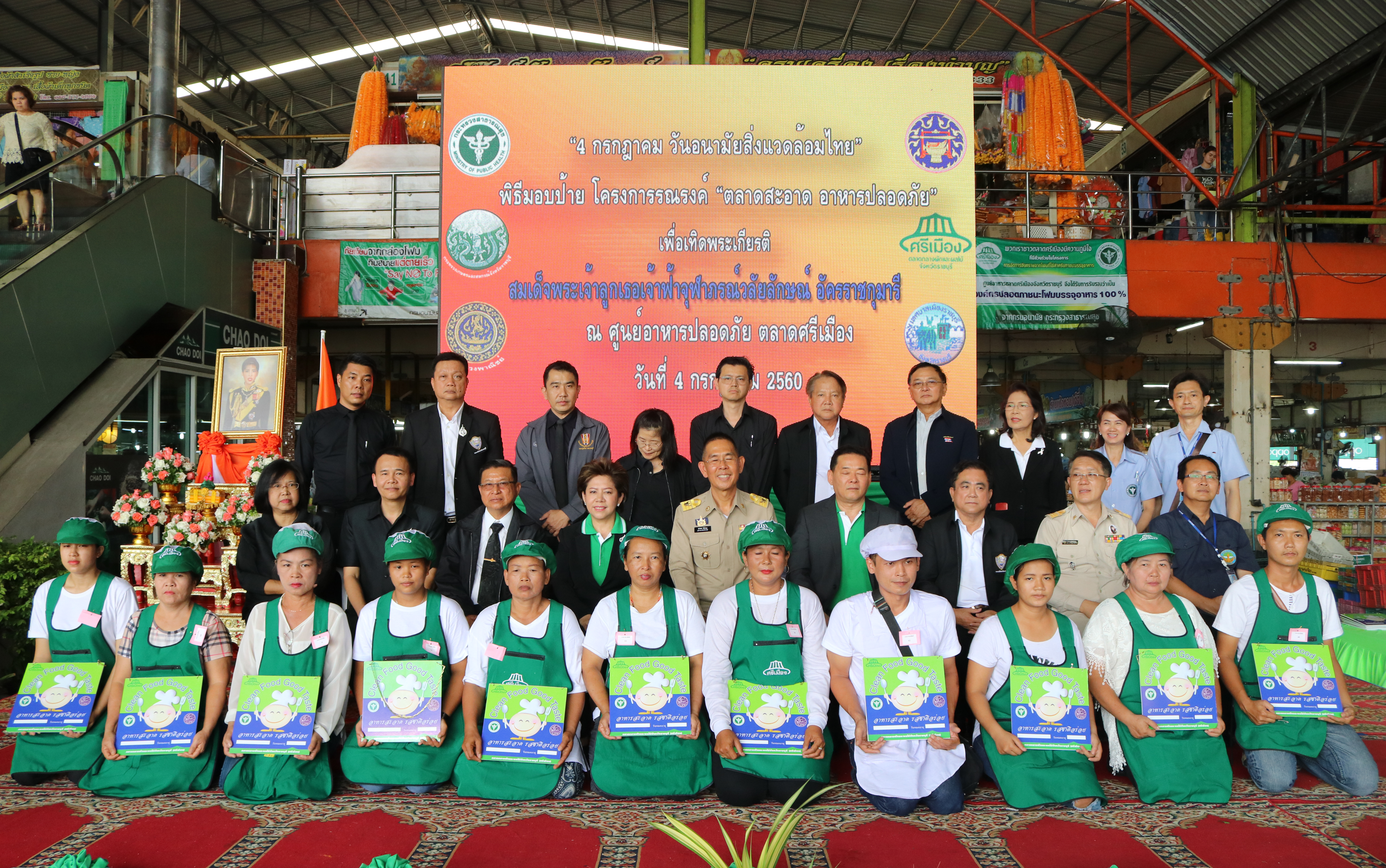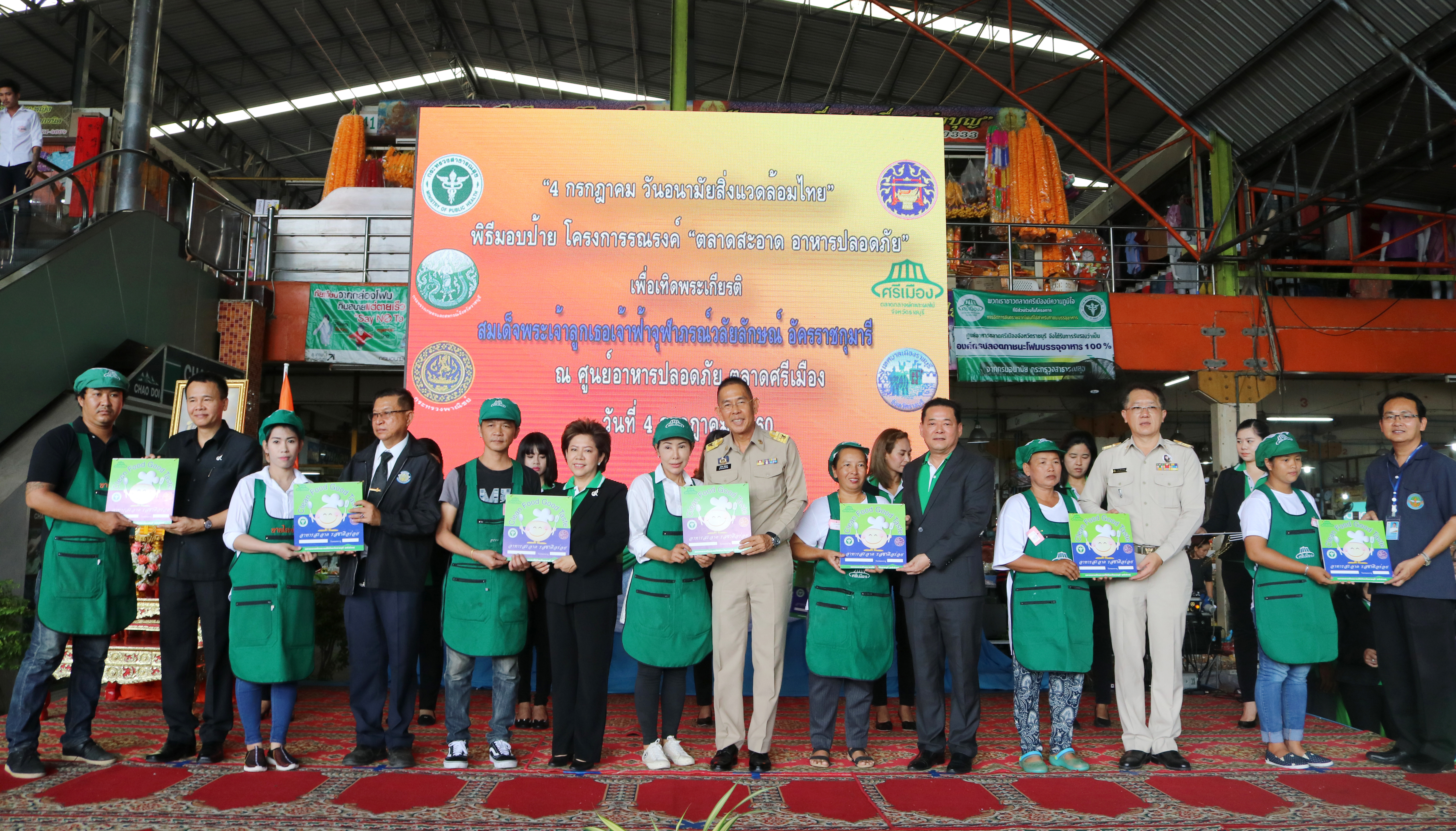 นายชัยวัฒน์ ชื่นโกสุม ผู้ว่าราชการจังหวัดราชบุรี เป็นประธานในพิธีมอบป้ายรับรองแก่ผู้ประกอบการในตลาดศรีเมืองที่ผ่านการตรวจประเมินตามโครงการ “ตลาดสะอาด อาหารปลอดภัย” จำนวนทั้งสิ้น 182 คน โดยนายนภินทร ศรีสรรพางค์ ประธานกรรมการบริหารตลาดศรีเมือง กล่าวรายงานวัตถุประสงค์การจัดงาน ซึ่งมีผู้แทนจากหน่วยงานราชการร่วมเป็นเกียรติมอบป้าย สำหรับกิจกรรมดังกล่าวจัดขึ้นเพื่อเป็นการเทิดพระเกียรติ สมเด็จพระเจ้าลูกเธอ เจ้าฟ้าจุฬาภรณ์วลัยลักษณ์ อัครราชกุมารีเจ้าฟ้านักพัฒนาอนามัยสิ่งแวดล้อม เนื่องในโอกาสวันคล้ายวันประสูติและพระชันษาครบ 5 รอบ สอดรับกับนโยบายของรัฐบาล “ครัวไทยสู่ครัวโลก” ณ บริเวณอาคารศูนย์อาหารปลอดภัย ตลาดศรีเมือง เมื่อวันที่ 4 กรกฎาคม 2560