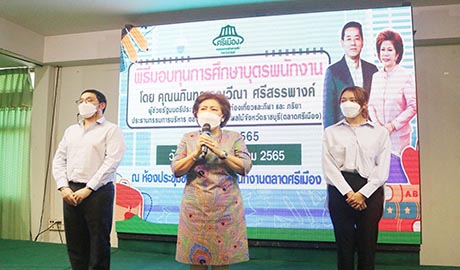 คุณวีณา ศรีสรรพางค์ รอง ปธ.กก.บริหาร เป็นประธานกล่าวให้โอวาทพร้อมมอบทุนการศึกษาให้กับบุตรพนักงานตลาดศรีเมือง โดยมีคุณภาคิน - คุณณัฐพร ศรีสรรพางค์ ผู้บริหารระดับสูงร่วมมอบ ณ ห้องประชุมชั้น 3 สำนักงานศรีเมือง เมื่อวันที่ 25 พฤษภาคม 2565 สำหรับการมอบทุนดังกล่าวเป็นความประสงค์ของคุณนภินทร - คุณวีณา ศรีสรรพางค์ ผู้ช่วยรัฐมนตรีประจำกระทรวงการท่องเที่ยวและกีฬา ประธานกรรมการบริหารตลาดศรีเมือง และครอบครัวที่ต้องการสร้างขวัญกำลังใจ ลดภาระค่าใช้จ่ายให้แก่พนักงานในช่วงภาวะเศรษฐกิจยุคโควิด - 19 รวมทั้งส่งเสริมสนับสนุนการศึกษาแก่บุตรพนักงาน จำนวน 111 ทุน โดยแบ่งเป็นระดับชั้นอนุบาลถึงระดับปริญญาตรี เป็นเงินทั้งสิ้น 179,000 บาท
