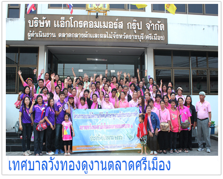 คุณรุ่งทิพ ชัยประเสริฐ รองนายกเทศมนตรีเทศบาลตำบลวังทอง นำคณะศึกษาดูงานซึ่งเป็นผู้ประกอบการค้าตลาดสดและเจ้าหน้าที่เทศบาลตำบลวังทอง มาศึกษาดูงานที่ตลาดศรีเมือง เพื่อนำแนวทางการดำเนินงานไปพัฒนาและปรับปรุงตลาดของเทศบาลตำบลวังทอง ให้ได้มาตรฐานตลาดสดน่าซื้อต่อไป โดยมีคุณประดิษฐ เหลืองทองเจริญ ผู้ช่วยกรรมการผู้จัดการตลาดศรีเมือง พร้อมด้วยคุณธนภณ พัฒนา ผู้จัดการฝ่ายพัฒนาการตลาด ให้การต้อนรับ ณ ห้องประชุมชั้น 3 สำนักงานตลาดศรีเมือง เมื่อวันที่ 27 กุภาพันธ์ 2556