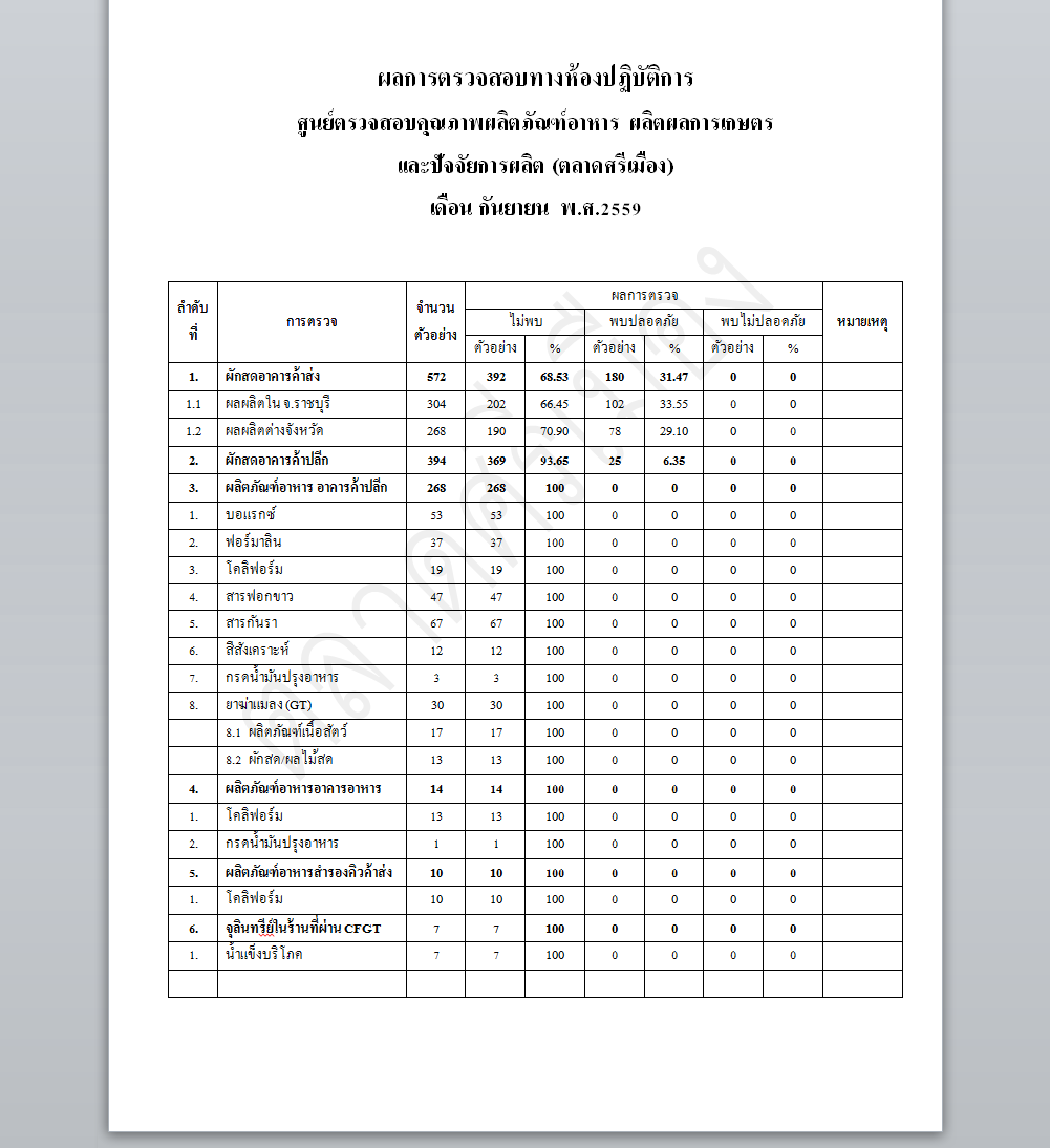 ผลการตรวจสอบทางห้องปฏิบัติการ ศูนย์ตรวจสอบคุณภาพผลิตภัณฑ์อาหาร ผลิตผลการเกษตร และปัจจัยการผลิต (ตลาดศรีเมือง) เดือน กันยายน พ.ศ.2559     8 ต.ค. 2559