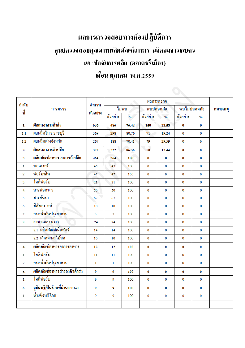 ผลการตรวจสอบทางห้องปฏิบัติการ ศูนย์ตรวจสอบคุณภาพผลิตภัณฑ์อาหาร ผลิตผลการเกษตร และปัจจัยการผลิต (ตลาดศรีเมือง) เดือน ตุลาคม พ.ศ.2559     8 พ.ย. 2559
