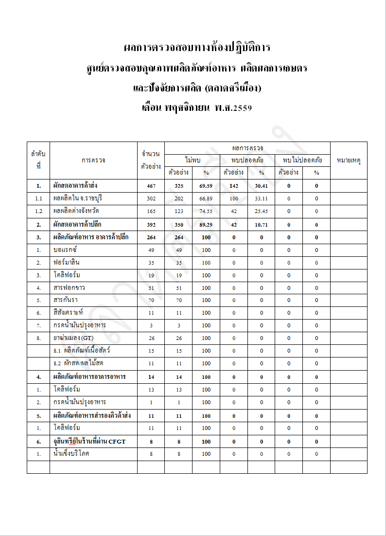 ผลการตรวจสอบทางห้องปฏิบัติการ ศูนย์ตรวจสอบคุณภาพผลิตภัณฑ์อาหาร ผลิตผลการเกษตร และปัจจัยการผลิต (ตลาดศรีเมือง) เดือน พฤศจิกายน พ.ศ.2559     24 ธ.ค. 2559