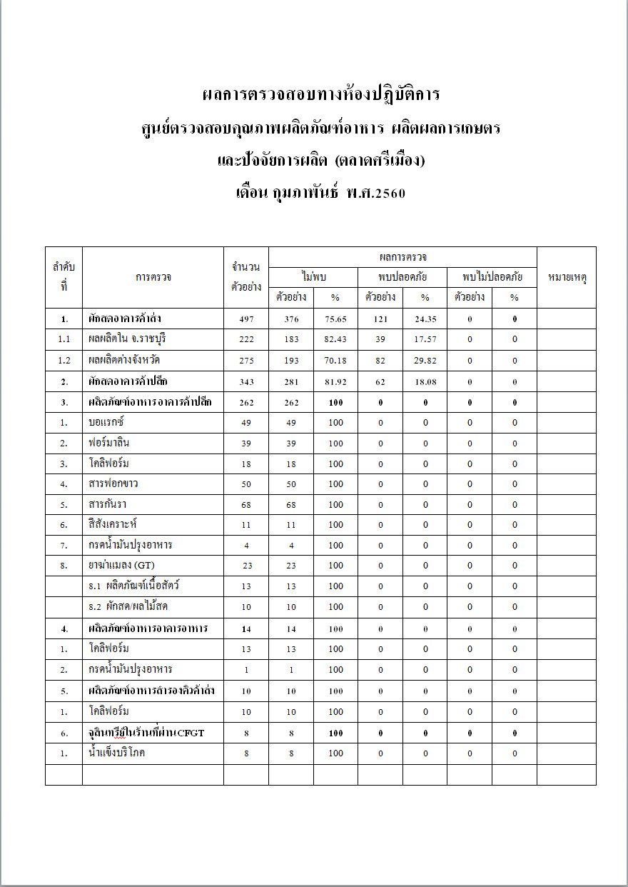 ผลการตรวจสอบทางห้องปฏิบัติการ ศูนย์ตรวจสอบคุณภาพผลิตภัณฑ์อาหาร ผลิตผลการเกษตร และปัจจัยการผลิต (ตลาดศรีเมือง) เดือน กุมพาพันธ์ พ.ศ.2560     20 มี.ค. 2560