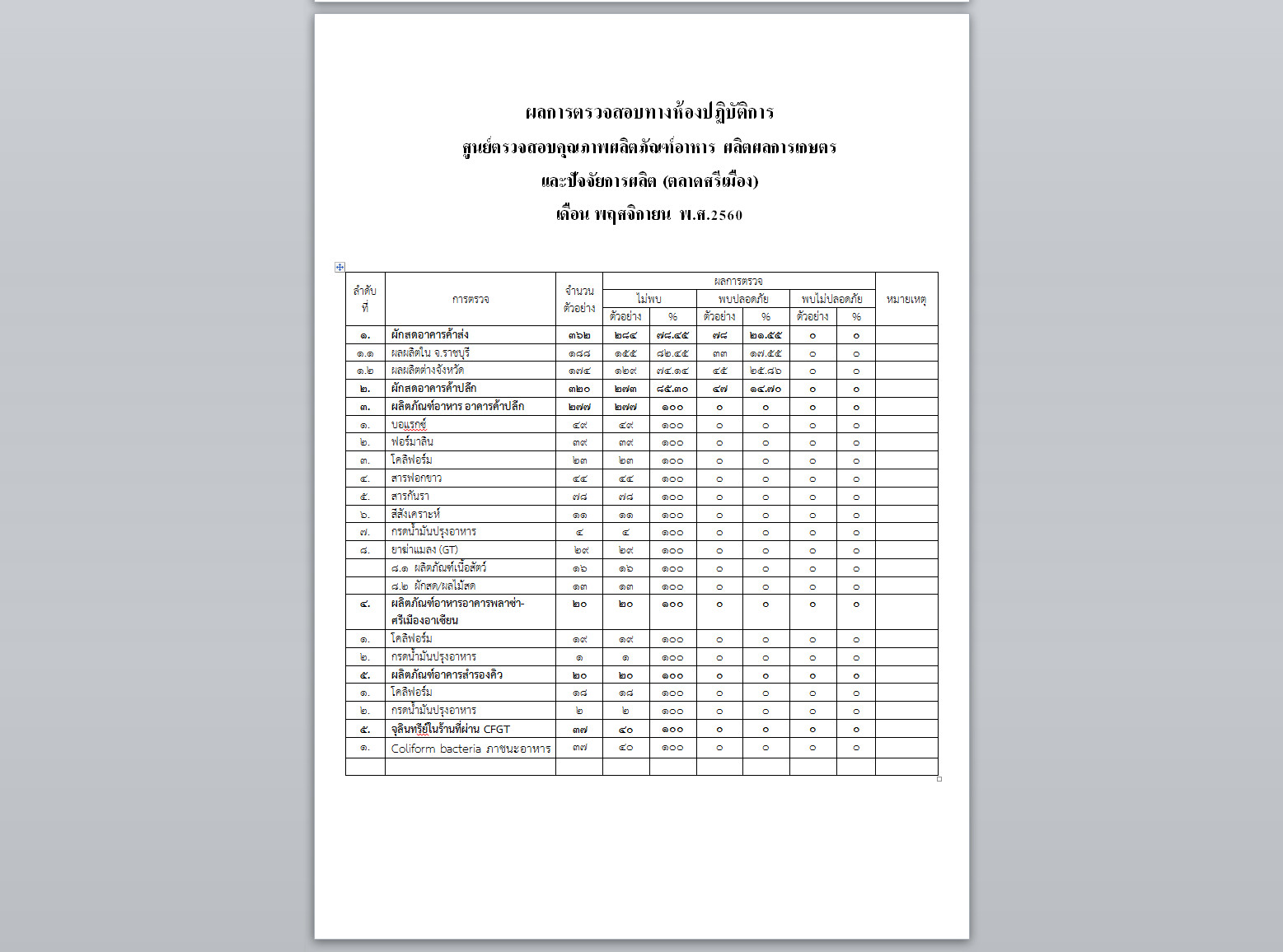 ผลการตรวจสอบทางห้องปฏิบัติการ ศูนย์ตรวจสอบคุณภาพผลิตภัณฑ์อาหาร ผลิตผลการเกษตร และปัจจัยการผลิต (ตลาดศรีเมือง) เดือน พฤศจิกายน พ.ศ.2560     14 ธ.ค. 2560