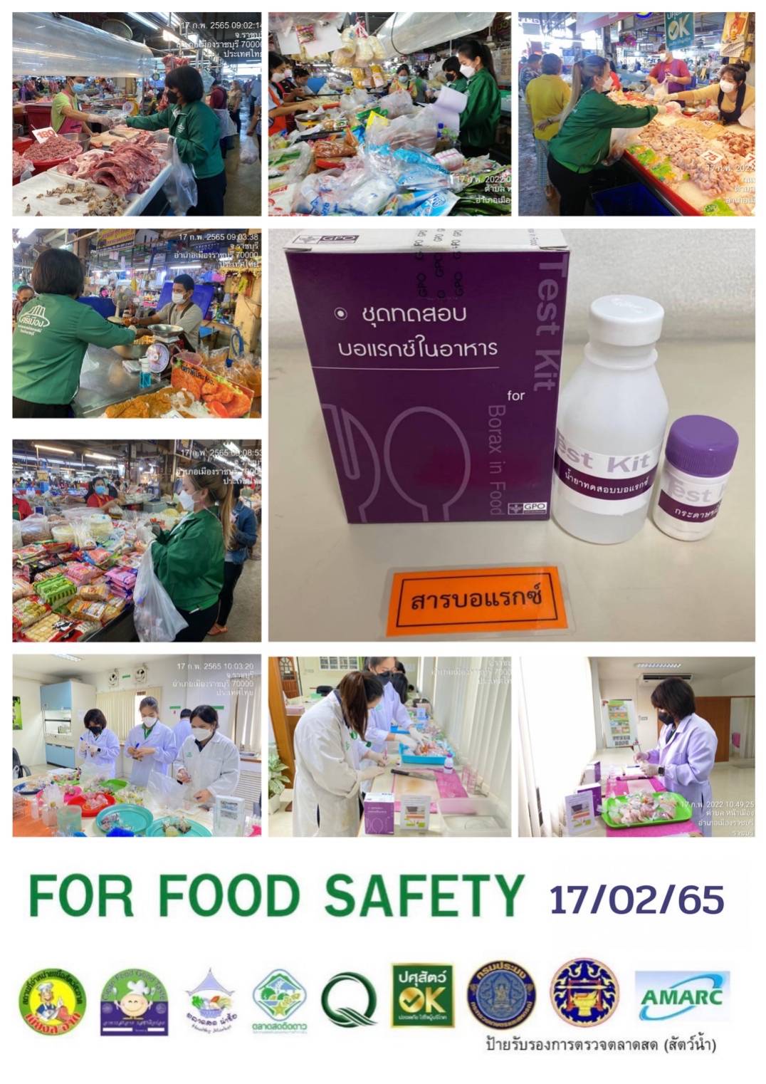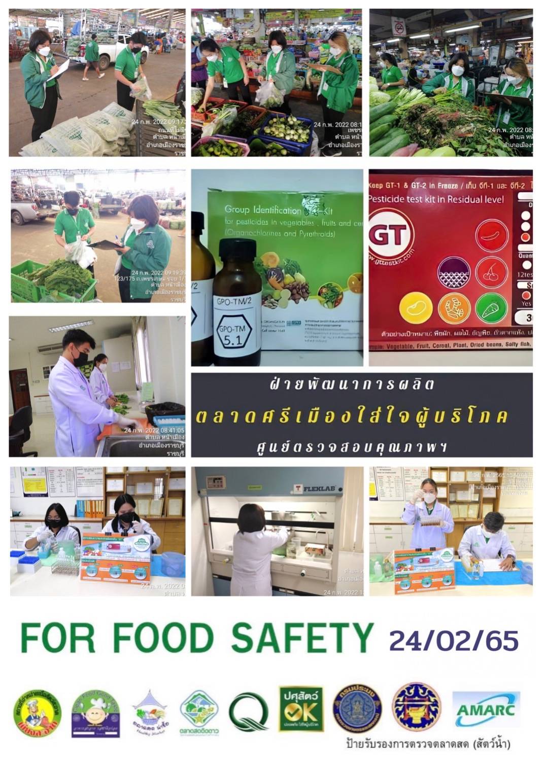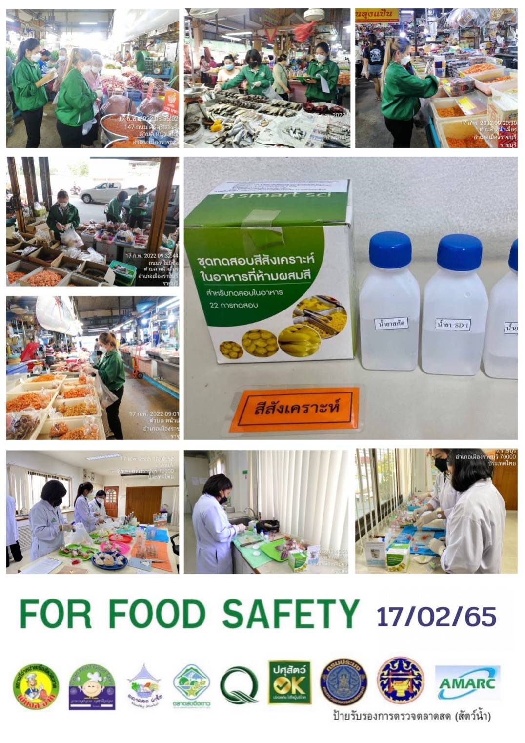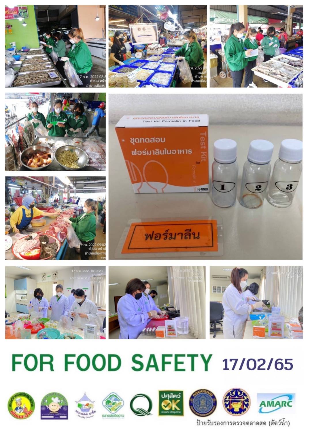 สรุปผลการตรวจสอบสารพิษตกค้างในผลผลิตการเกษตรและผลิตภัณฑ์อาหาร (ตลาดศรีเมือง) ประจำเดือน กุมภาพันธ์ 2565 - GT จำนวน 1,107 ตัวอย่าง ไม่พบ 1,069 ตัวอย่าง พบในระดับปลอดภัย 38 ตัวอย่าง - GPO จำนวน 87 ตัวอย่าง ไม่พบ 87 ตัวอย่าง - บอแรกซ์ 58 ตัวอย่าง ไม่พบ 58 ตัวอย่าง - ฟอร์มาลีน 53 ตัวอย่าง ไม่พบ 50 ตัวอย่าง พบ 3 ตัวอย่าง ได้แก่ ปลากหมึกอาเจน 2 ตัวอย่าง ปลาหมึกกรอบ 1 ตัวอย่าง - สารเร่งเนื้อแดง 21 ตัวอย่าง ไม่พบ 21 ตัวอย่าง - สารฟอกขาว 52 ตัวอย่าง ไม่พบ 52 ตัวอย่าง - สารกันรา 83 ตัวอย่าง ไม่พบ 83 ตัวอย่าง - สีสังเคราะห์ 31 ตัวอย่าง ไม่พบ 31 ตัวอย่าง - โพลาร์ในน้ำมันทอดซ้ำ 10 ตัวอย่าง ไม่พบ 10 ตัวอย่าง - เชื้อโคลิฟอร์ม 212 ตัวอย่าง ไม่พบ 212 ตัวอย่าง