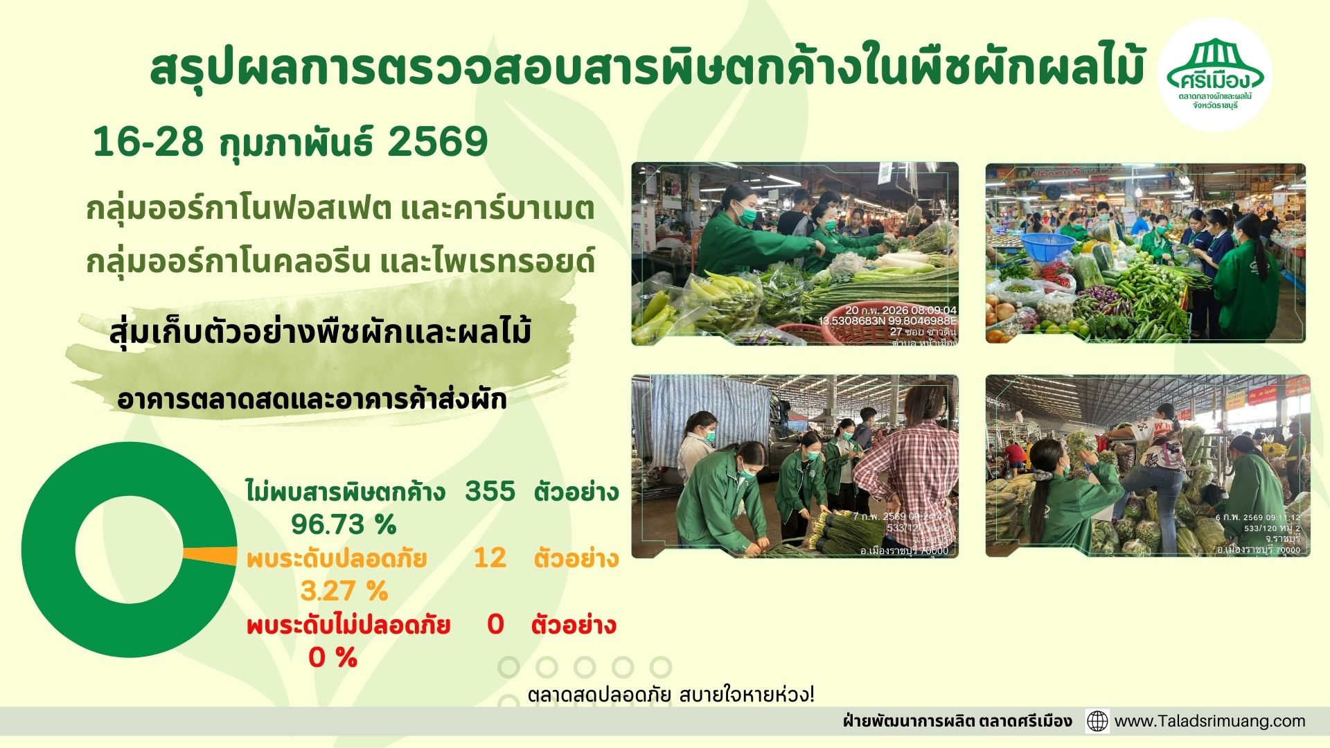 ผลการตรวจสอบสารเคมีตกค้างในผักผลไม้และผลการตรวจสอบอาหารระหว่างวันที่ 16-28 กุมภาพันธ์ 2569