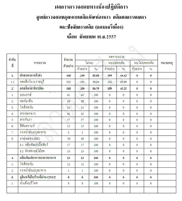 รายงานผลการตรวจสอบทางห้องปฏิบัติการ ศูนย์ตรวจสอบคุณภาพผลิตภัณฑ์อาหาร ผลิตผลการเกษตร และปัจจัยการผลิต เดือน กันยายน 2557    17 พ.ย. 2557