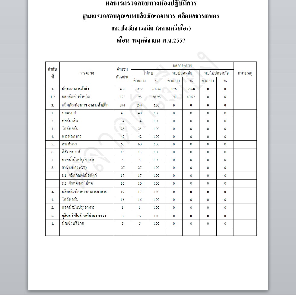 รายงานผลการตรวจสอบทางห้องปฏิบัติการ ศูนย์ตรวจสอบคุณภาพผลิตภัณฑ์อาหาร ผลิตผลการเกษตร และปัจจัยการผลิต เดือน พฤศจิกายน 2557    6 ธ.ค. 2557