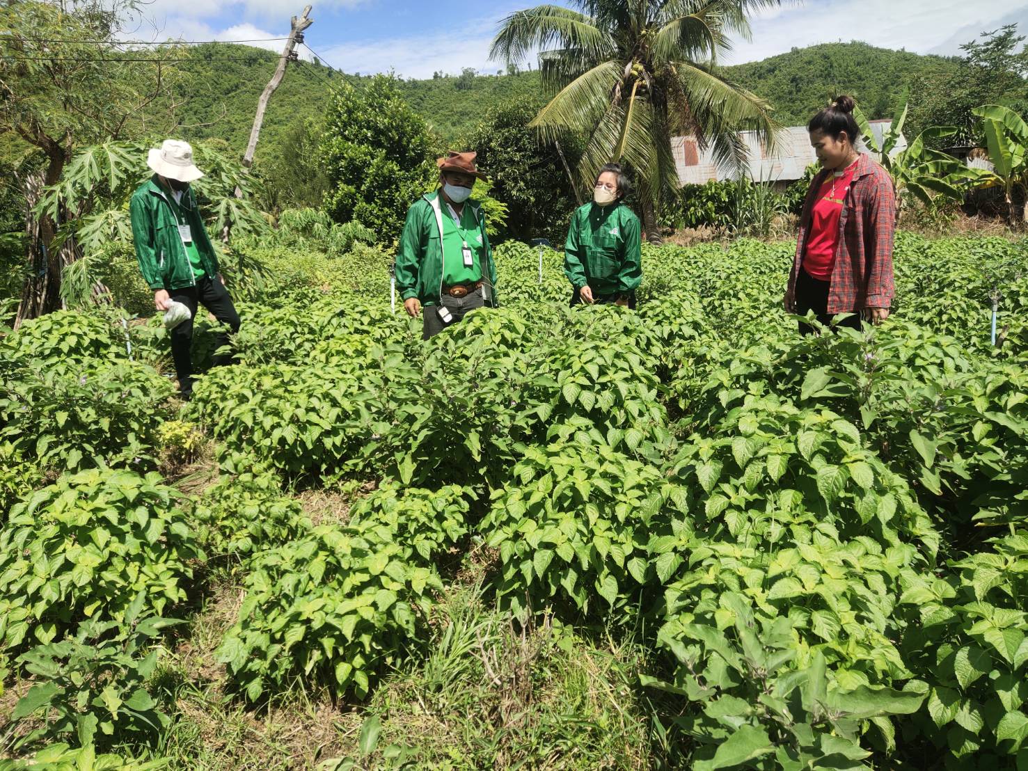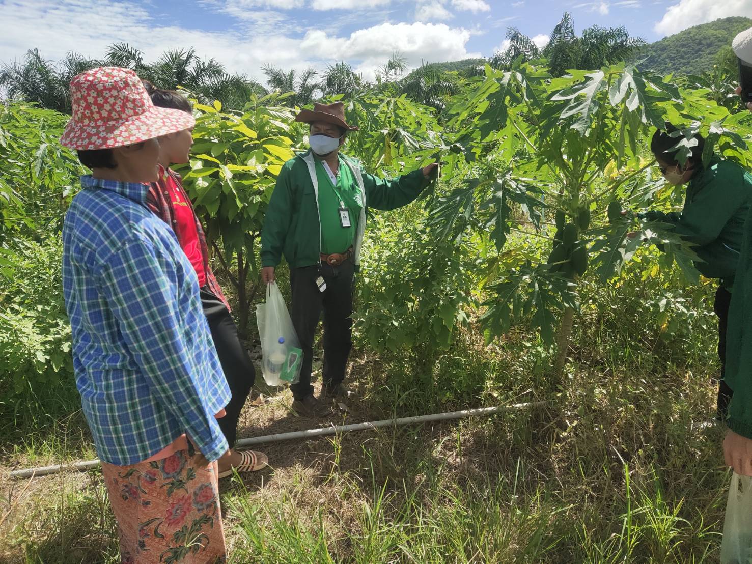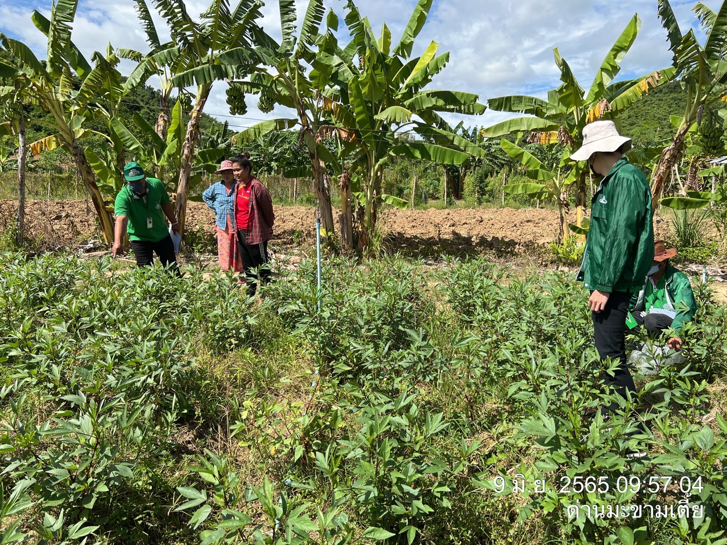 ภาคเช้าวันที่ 9มิถุนายน 2565 เวลา10.30น.ฝ่ายพัฒนาการผลิต ออกพื้นที่ตรวจแปลงคุณจุฑารัตน์ ยางอ่อน สมาชิกในโครงการผักปลอดภัยกลุ่มบ้านวังปลา ต.จรเข้เผือก อ.ด่านมะข้ามเตี้ย จ.กาญจนบุรี ขอเพิ่มชนิดพืช ใบกระเจี๊ยบและมะละกอ เข้าจำหน่ายในโครงการ ฝ่ายดำเนินการเก็บข้อมูลการผลิต,เก็บตัวอย่างผลผลิต,ตรวจวัดค่าpHดินและน้ำผลการตรวจค่าphได้เท่ากับ 6.8 และทางฝ่ายได้ตรวจพบใบกระเจี๊ยบและต้นมีอาการเหี่ยวและยืนต้นตาย สาเหตุเกิดจากเชื้อรา ฝ่ายได้แนะนำใช้สารชีวภัณฑ์ ในการป้องกันกำจัด เชื้อสาเหตุ : รา Phytophthora parasitica Dastur ชีววิทยาของเชื้อ : รา P. parasitica เป็นราที่ชอบน้ำ (water mold) ลักษณะโคโลนีที่เจริญบนอาหาร PDA คล้ายเส้นใยแมงมุม เส้นใยของราพวกนี้ไม่มีผนังกั้น ผิวผนังเรียบ เชื้อเจริญเต็มจานเลี้ยงเชื้อเมื่ออายุ 5 วัน สร้าง sporangia น้อย หรือไม่สร้าง sporangia บนผิวอาหารแข็ง เมื่อตัดชิ้นเชื้อแช่ในน้ำที่นึ่งฆ่าเชื้อแล้ว ทิ้งไว้ 24-36 ชั่วโมง เชื้อสร้าง sporangia จำนวนมากในน้ำ มีรูปค่อนข้างกลมรูปแพร์หรือกลม มีปุมนูน ชัดเจนบนสปอร์ ซึ่งติดแน่นกับเส้นใย สปอร์ผนังหนามี papilla เห็นเด่นชัด ลักษณะอาการ : เชื้อเข้าทำลายบริเวณรากและลำด้น ทำให้มะเขือแสดงอาการเหี่ยวเฉาเหมือนขาดน้ำ เมื่อใช้มีดเฉือนตามขวางลำต้นพบท่อน้ำท่ออาหารถูกทำลาย เนื้อเยื่อพืชเป็นสีน้ำตาลดำหรือสีดำ เกิดการ เน่ารอบต้นทำให้ส่วนที่เป็นโรคจนถึงยอด มีอาการเหี่ยวและแห้งตาย หากเชื้อเข้าทำลายใบ ทำให้ใบไหม้คล้าย ถูกน้ำร้อนลวก เชื้อเข้าทำลายที่บริเวณขั้วผลโดยการกระเด็นของน้ำ หรือบริเวณปลายผลที่ติดกับพื้นดิน ทำให้ เกิดอาการฉ่ำน้ำ แล้วลุกลามขยายออกไปอย่างรวดเร็ว จนทำให้ผลเน่าดำเกือบทั้งผล การป้องกันกำจัด : หลังจากที่ได้วิเคราะห์สาเหตุของโรคแล้วทางฝ่ายฯได้แนะนำให้เกษตรกรเก็บเศษซากพืชหรือส่วนที่เป็นโรคออกไปเผาลดปริมาณการให้น้ำลง(เพราะดูจากพื้นที่แล้วให้น้ำมากไปและแฉะ)ควรทำร่องระบายน้ำให้ดี ไม่เป็นที่น้ำขังและไม่ปลูกมะเขือแน่นและแนะนำให้เกษตรกรฉีดพ่นด้วยเชื้อรา Trichoderma harzianum สลับกับการใช้เชื้อ Bacillus subtilis ฉีดพ่นในช่วงแรก ทั้งพ้นที่ลำตันพืชและพ่นลงในดิน จะช่วยกำจัดเชื้อสาเหตุได้