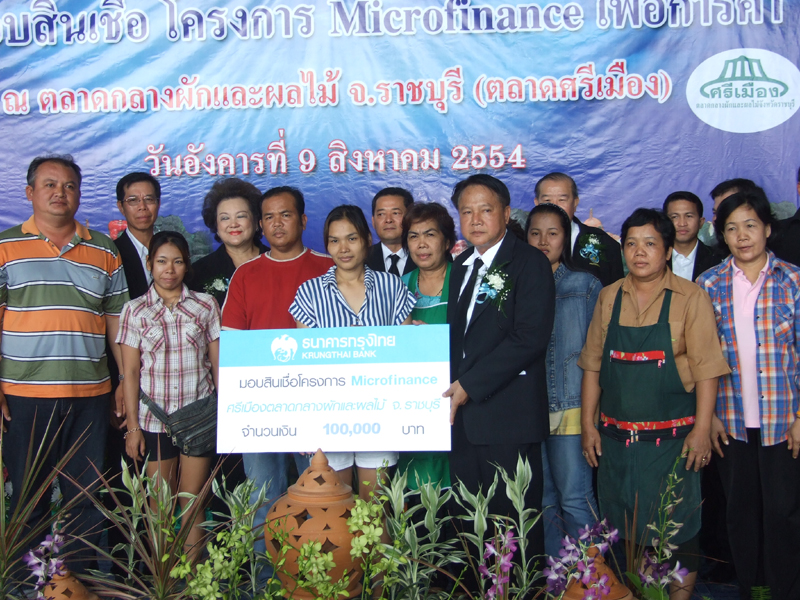 โครงการต้นแบบสินเชื่อ Microfinance กำหนดคุณสมบัติผู้ค้าขายในตลาดที่ ดำเนินธุรกิจมาแล้วตั้งแต่ 1 ปีขึ้นไป ให้สามารถเข้าร่วมโครงการได้ โดยกำหนดวงเงินรายละ ไม่เกิน 100,000 บาท หลักประกันผ่อนปรนเป็นพิเศษ ระยะเวลากู้ไม่เกิน 24 เดือน และลูกค้า เดิมที่มีประวัติผ่อนชำระหนี้ดีตามเงื่อนไข สามารถขอสินเชื่อเพิ่มได้อย่างต่อเนื่อง ในการนี้ มีผู้ประกอบการค้าตลาดศรีเมืองให้ความสนใจยื่นความจำนงกว่า 200 ราย และได้รับมอบ สินเชื่อ Microfinance แล้วจำนวน 33 ราย วงเงินรวม 2,250,000 บาท ผู้ประกอบการค้าท่านใด ที่สนใจสามารถติดต่อได้ที่ธนาคารกรุงไทยทุกสาขา
