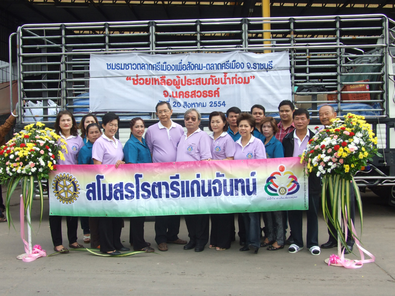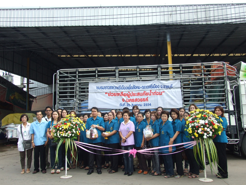 เมื่อวันที่ 20 สิงหาคม 2554 คุณวีณา  ศรีสรรพางค์ ผู้ช่วยผู้จัดการ ตลาดศรีเมืองเป็นประธานในพิธีปล่อยขบวนรถบรรทุกของใช้ อุปโภคบริโภค ข้าวสารอาหารแห้ง เสื้อผ้ายารักษาโรค และของใช้ที่จำเป็น ในโครงการช่วยเหลือผู้ประสบภัยน้ำท่วมให้กับผู้ประสบภัยน้ำท่วม ต.ท่าไม้ อ.ชุมแสง จ.นครสวรรค์ โดยการนำทีมของ คุณสายพิรุณ  วังเย็น ( เจ๊เล็กเบย์-เบ็นซ์) ประธานชมรมชาวตลาดศรีเมืองเพื่อสังคม พร้อมด้วยคณะกรรมการและสมาชิกชมรมฯ ร่วมกับสำนักงาน บริษัท แอ็กโกรคอมเมอร์สกรุ๊ป จำกัด ( ตลาดศรีเมืองราชบุรี ) และสโมสรโรตารี่แก่นจันทน์