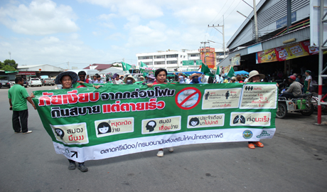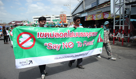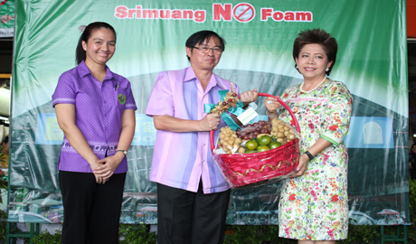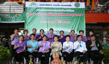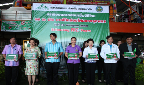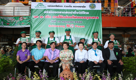 คุณนภินทร - คุณวีณา ศรีสรรพางค์ ผู้บริหารระดับสูงตลาดศรีเมือง พร้อมผู้บริหารตลาดศรีเมืองร่วมกับกรมอนามัย จัดกิจกรรม “รณรงค์ ลด ละ เลิก การใช้โฟมบรรจุอาหารในตลาดศรีเมือง” Say No To Foam โดยนพ.พิภพ เจนสุทธิเวชกุล นายแพทย์สาธารณสุข จ.ราชบุรี เป็นประธานเปิดงานและมอบใบประกาศเกียรติคุณให้แก่ผู้ประกอบการค้าที่เข้าร่วมโครงการ พร้อมมอบมอบป้าย clean food good test โดยมีคุณวีณา ศรีสรรพางค์ รองประธานกรรมการบริหารตลาดศรีเมือง คุณศมานันท์ เหล่าวณิชวิศิษฎ์ นายกเทศมนตรีเมืองราชบุรี นพ.ชลทิศ อุไรฤกษ์กุล ผอ.ศูนย์อนามัยที่ 4 ราชบุรี พญ.ปาจารีย์ อารีรบ รองนายแพทย์สาธารณสุข จ.ราชบุรี นพ.ทรงพล ชวาลตันพิพัทธ์ ผอ.รพ.ราชบุรี และคุณทรงพล ภุมรา ประธานชมรมชาวตลาดศรีเมือง ร่วมมอบใบประกาศเกียรติคุณฯ และร่วมเดินรณรงค์ ลด ละ เลิก การใช้โฟมบรรจุอาหาร ภายในตลาดศรีเมือง เมื่อวันที่ 10 กรกฏาคม 2558