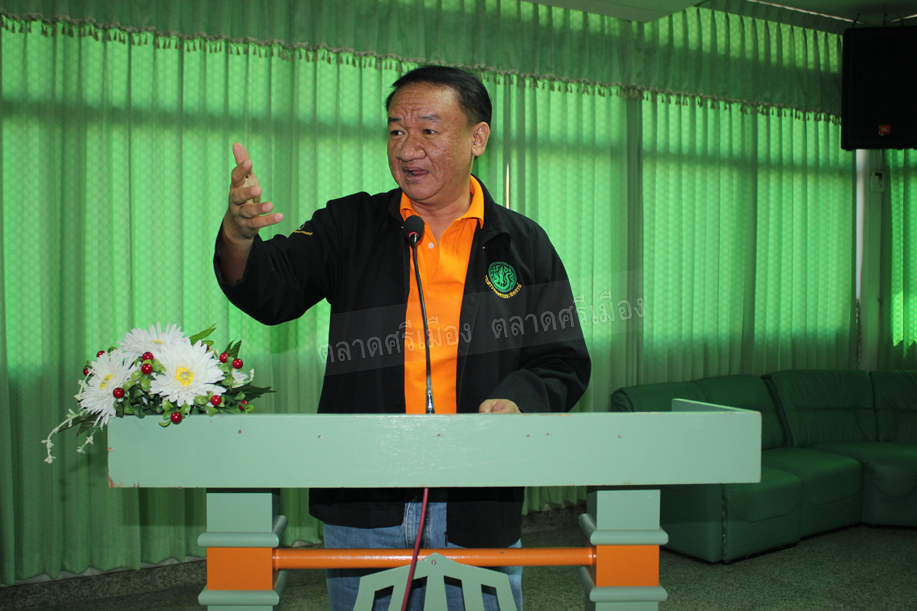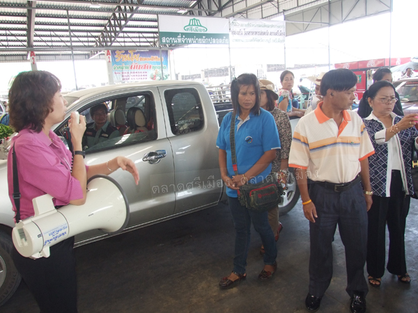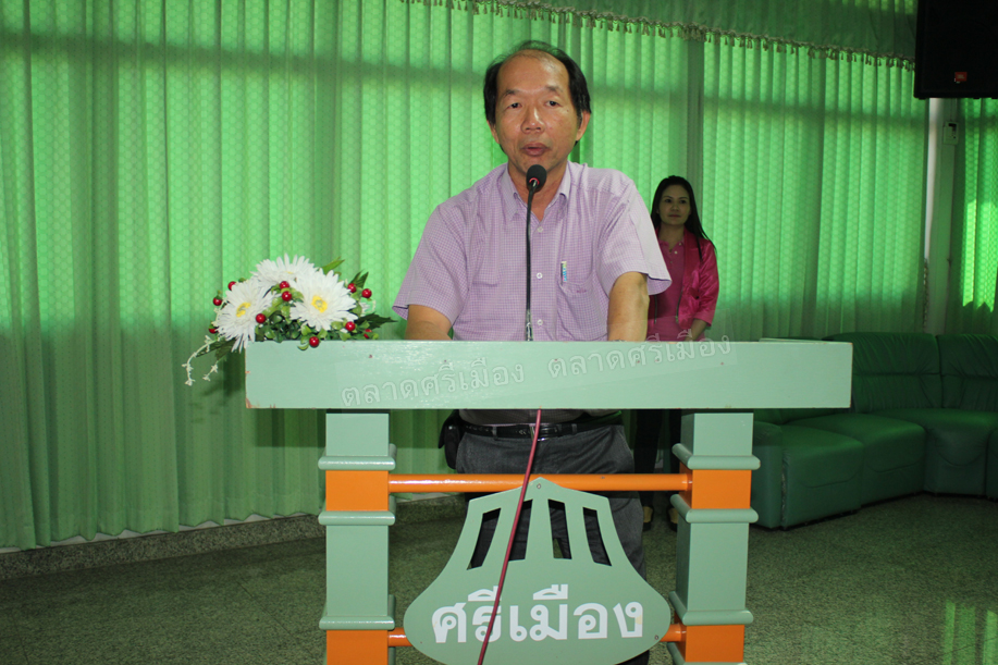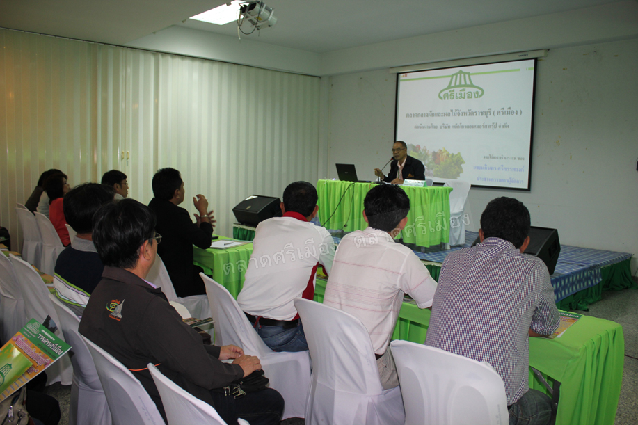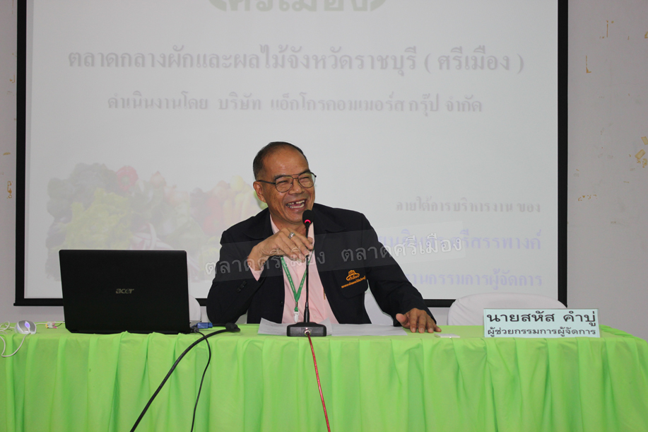 คุณสหัส คำบู่ ผู้ช่วยกรรมการผู้จัดการตลาดศรีเมืองให้การต้อนรับคณะศึกษาดูงานจากกรมส่งเสริมสหกรณ์ ในโอกาสเดินทางมาศึกษาดูงาน เมื่อวันที่ 8 มกราคม 2556 ณ ห้องประชุมชั้น 3 ตลาดศรีเมือง เพื่อให้ผู้แทนสถาบันเกษตรกรที่ทำธุรกิจรวบรวมและจำหน่ายผลไม้ได้มีความรู้ในเรื่องนวัตกรรมการจัดการ ยุทศาสตร์ เครือข่ายการดำเนินธุรกิจ พร้อมกันนี้คณะศึกษาดูงานได้เยี่ยมชมบริเวณต่างๆ ของตลาดศรีเมืองด้วย